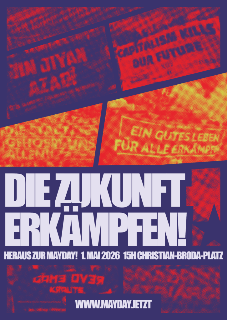 Mayday has always been rooted in the tradition of anti-authoritarian social movements. Authoritarian cadre structures, as well as any form of antisemitism, racism, queer- and transphobia, have no place in this demonstration. These principles also apply to participation in planning meetings and the demonstration itself.